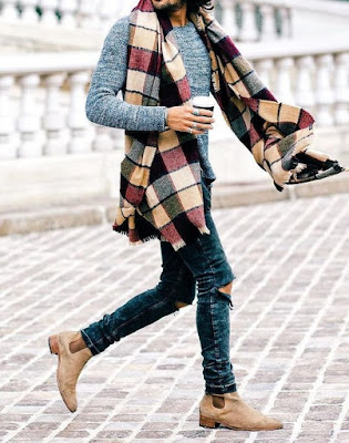 Schaut man sich den Look links an, trägt unser Style-Vorbild einen schlichten, melierten Strickpullover, eine zerrissene Jeans und lässige Chealsea-Boots… Sieht echt cool aus… ABER: Das Highlight ist der Oversized-Schal mit Karo-Muster in wunderschönen Herbstfarben… Perfekt! Klar fehlt da noch eine Jacke, aber wählt man da die richtige Lederjacke oder einen coolen Parka, ist der ideale Look fertig… und wenn das Herbstwetter etwas kälter wird, dann wickelt man sich den Schal locker um den Hals, damit man sich bloß keine Erkältung einholt und es schön gemütlich ist, wenn der kalte Wind bläst…